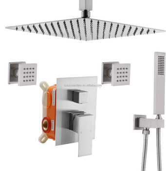 Sistema de ducha de latón cepillado, juego de cabezal de ducha de lluvia y masaje de 12 pulgadas con grifo termostático, válvula rugosa, diseño moderno